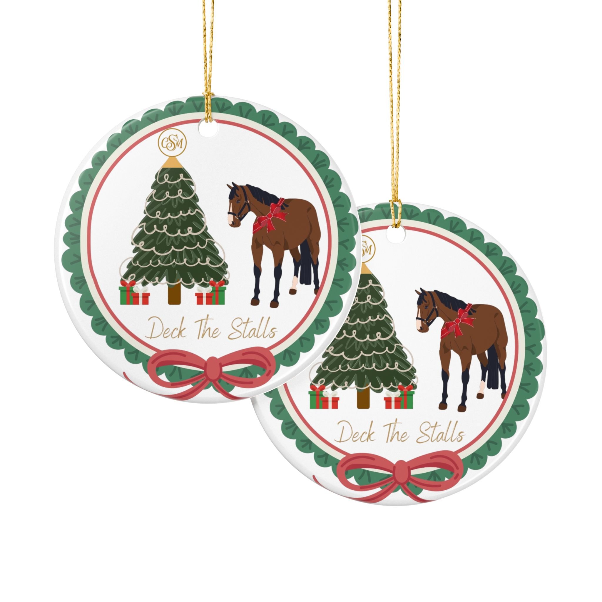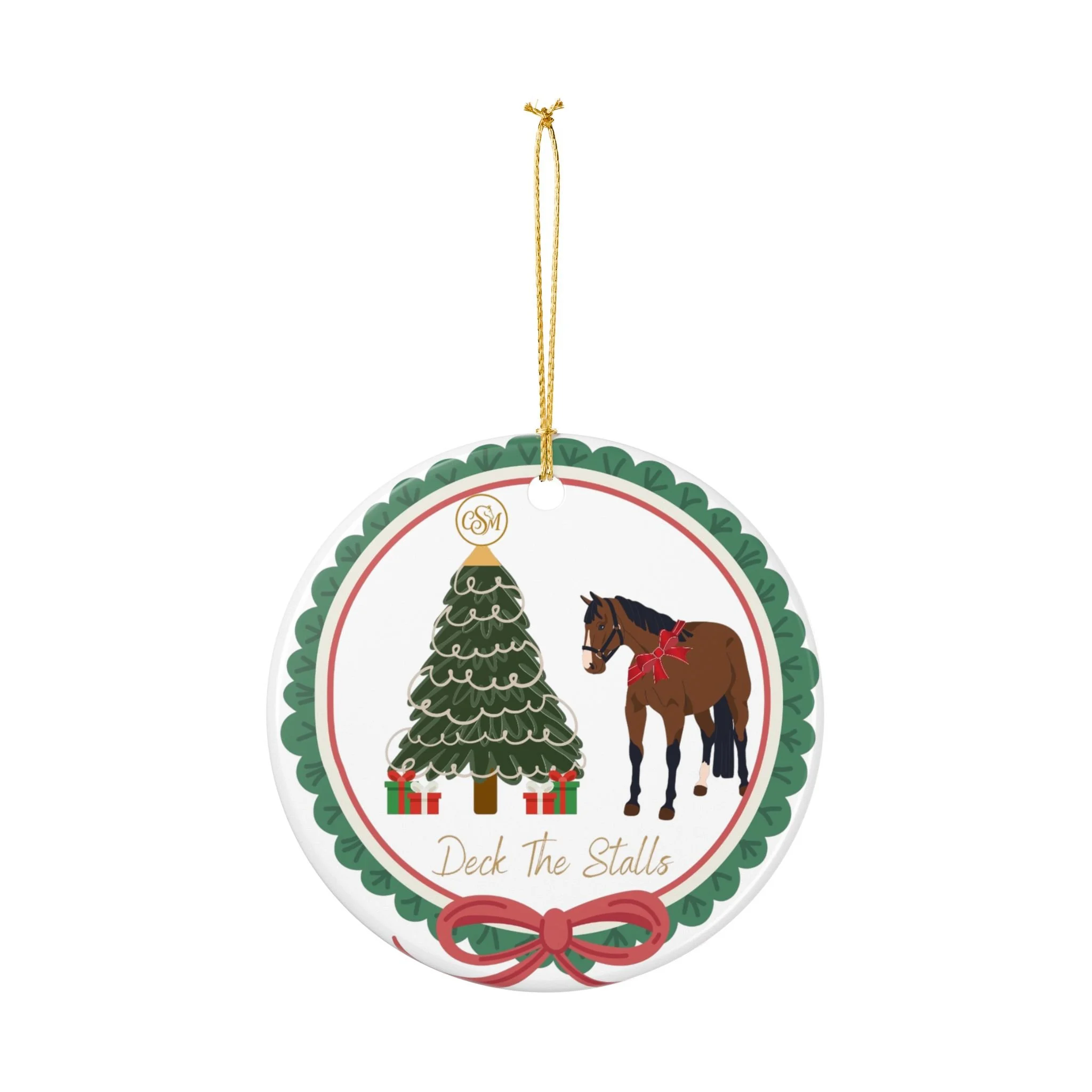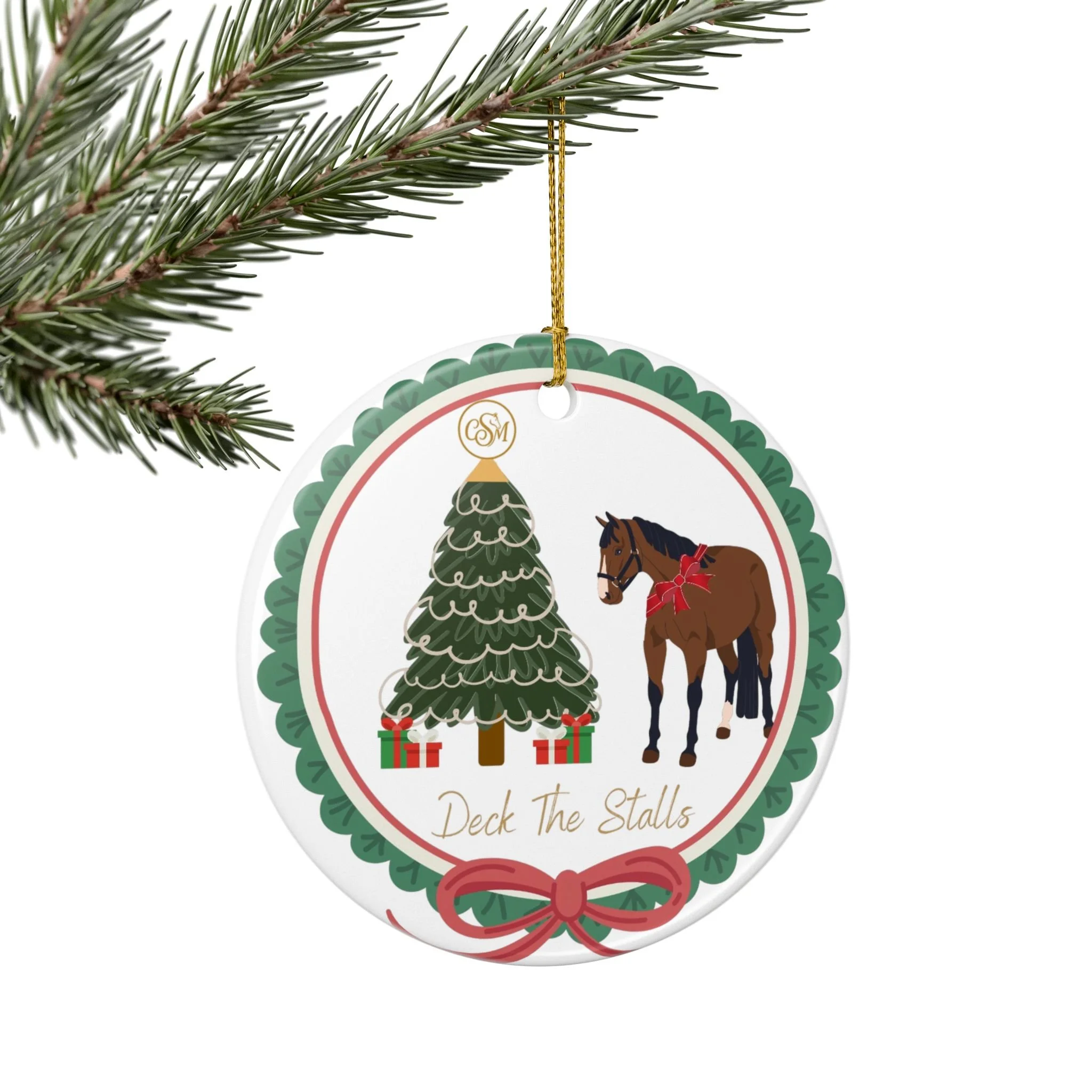 This playful Deck The Halls Christmas 2025 Benefit Ornament is highlights a sweet bay mare beside a Christmas tree wrapped in soft garlands and tiny presents. A slim gold string lets you hang it from a mantel, stable door, or favorite branch.