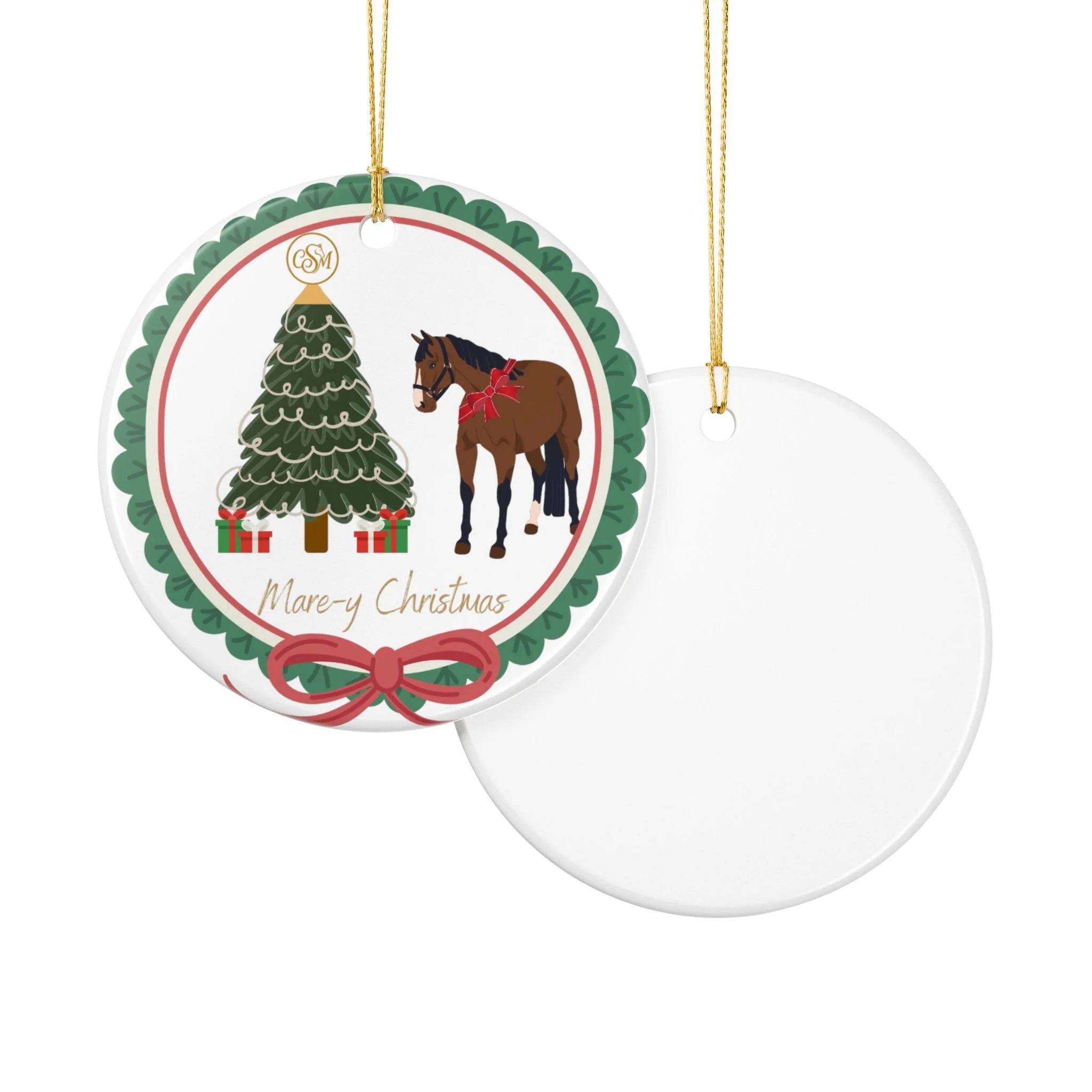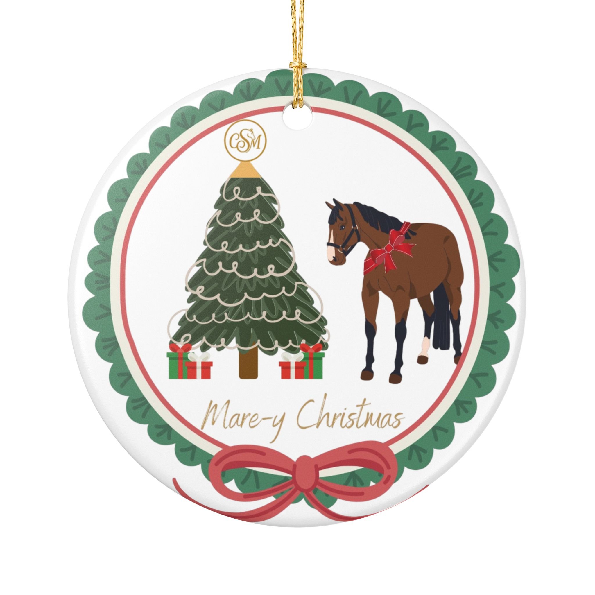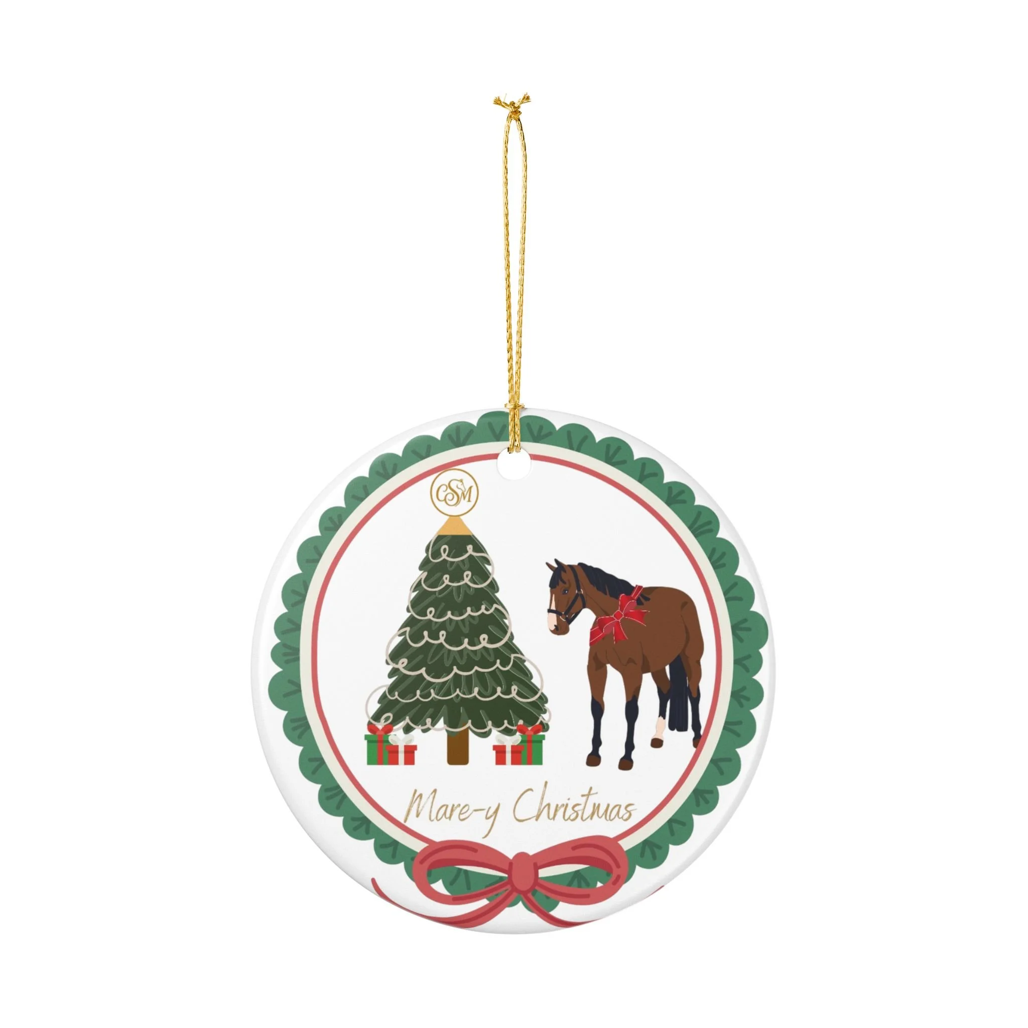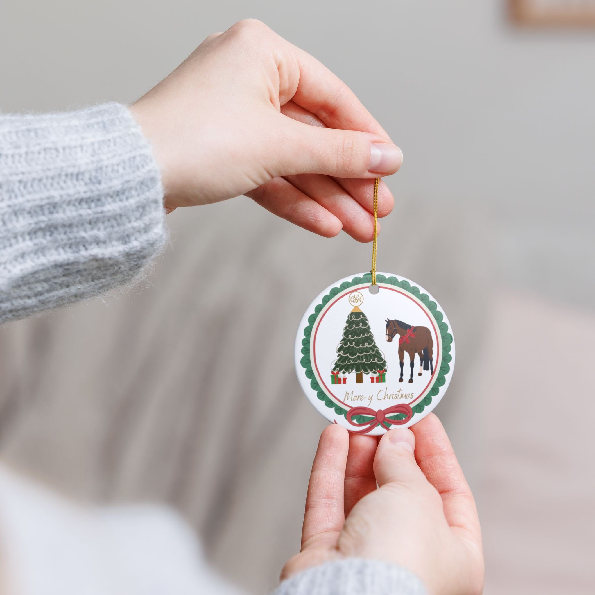 This playful Mare-y Christmas 2025 Benefit Ornament is highlights a sweet bay mare beside a Christmas tree wrapped in soft garlands and tiny presents. A slim gold string lets you hang it from a mantel, stable door, or favorite branch.